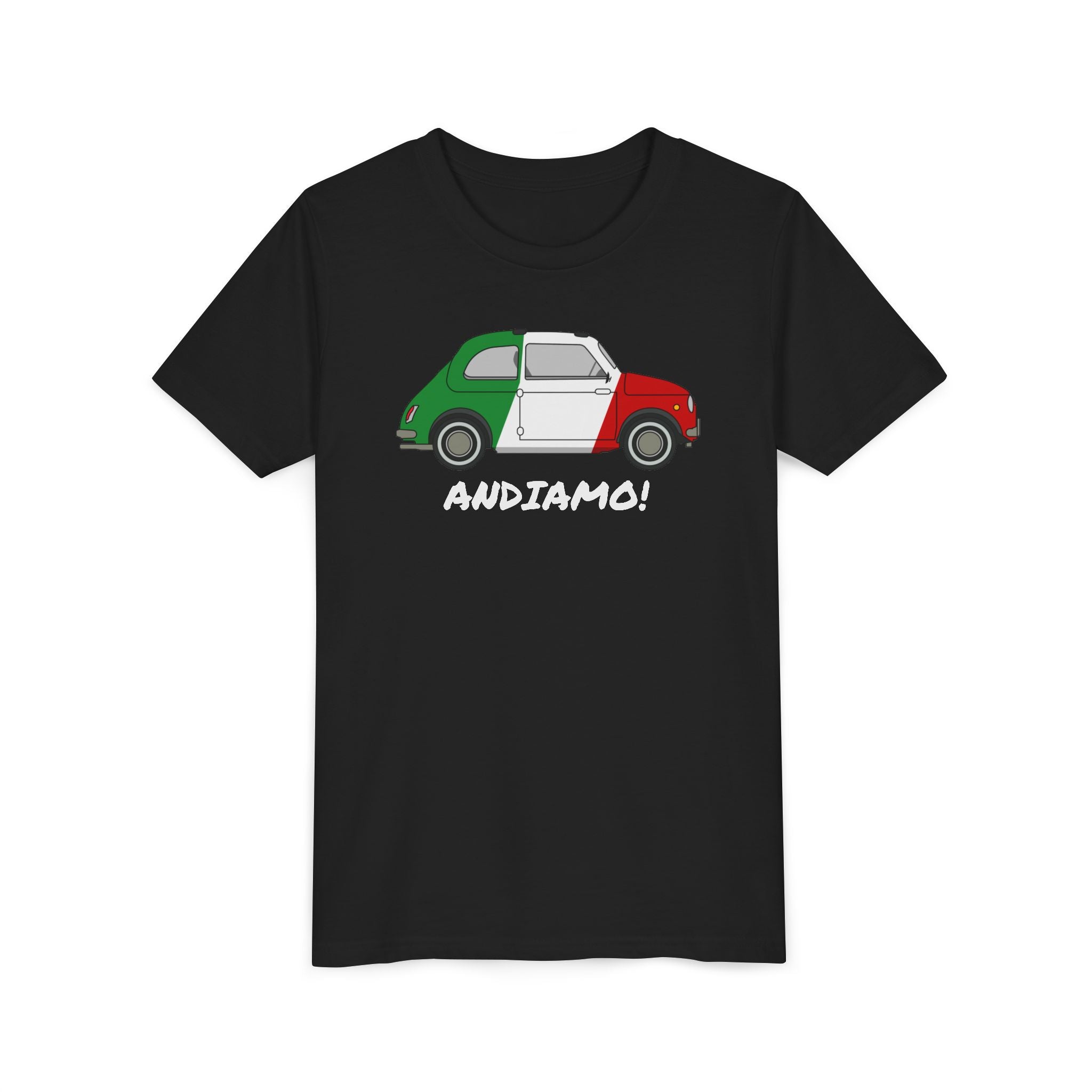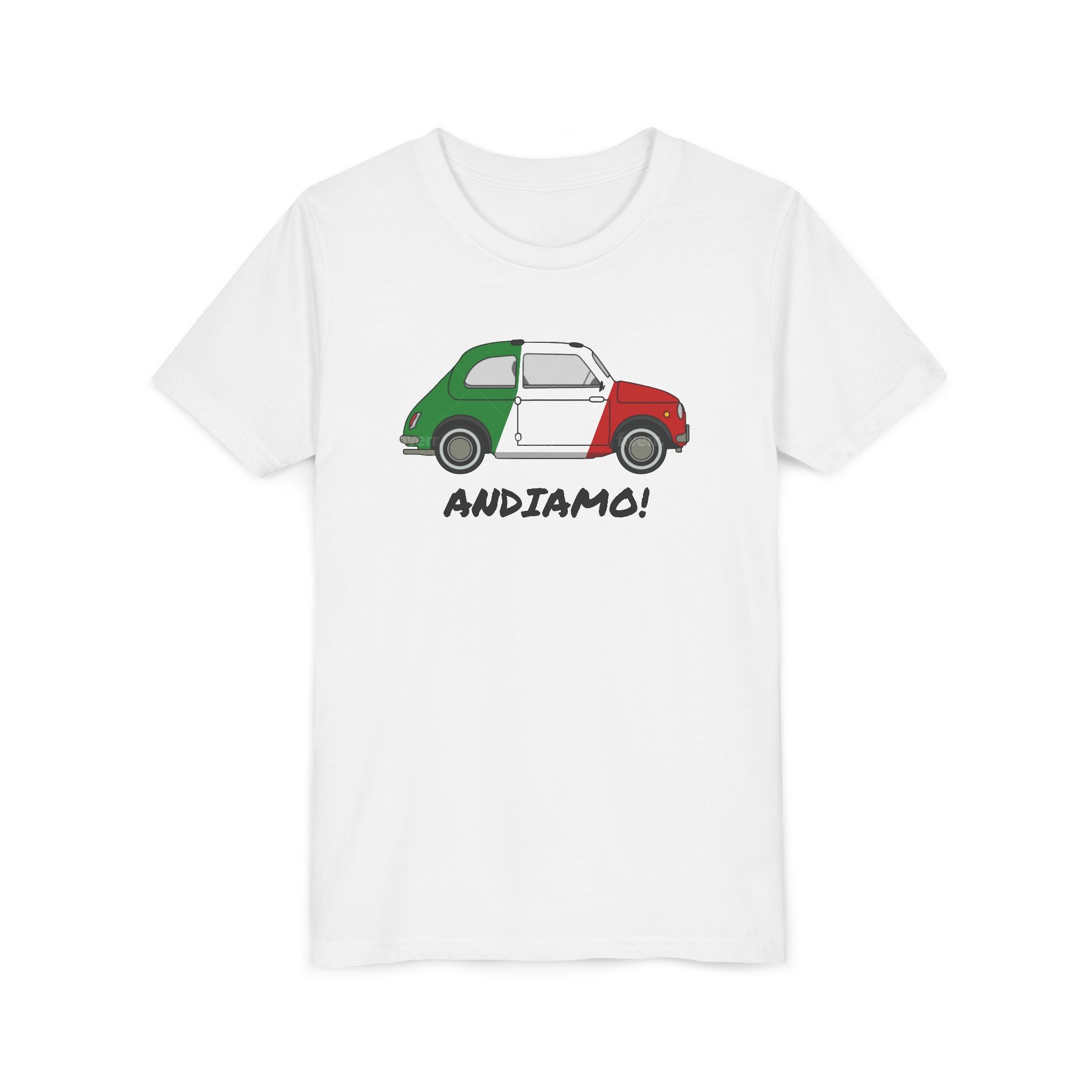 This youth t-shirt showcases a colorful illustration of a classic Fiat car painted in the green, white, and red of the Italian flag, with the word 'Andiamo'—meaning 'Let's go!'—printed underneath. Perfect for young adventurers and car lovers alike!