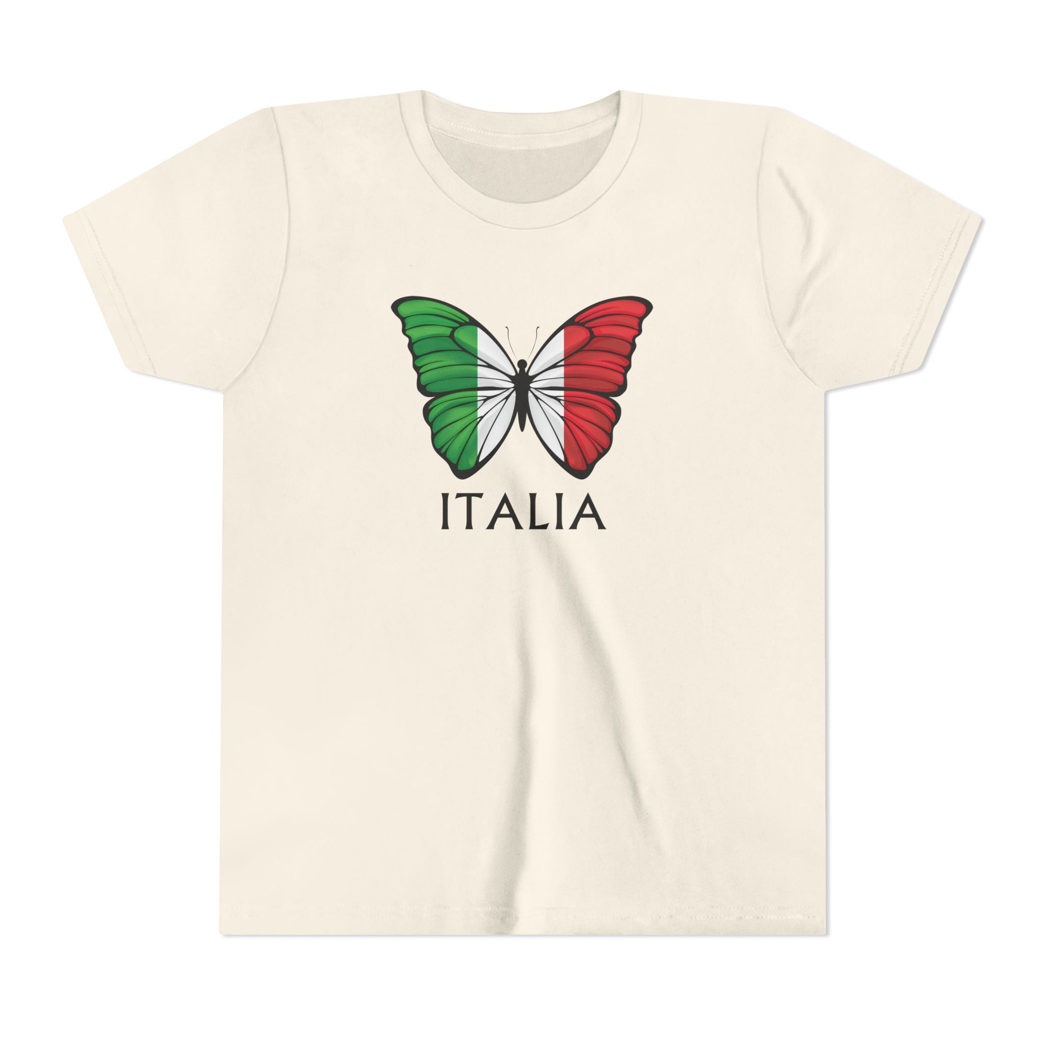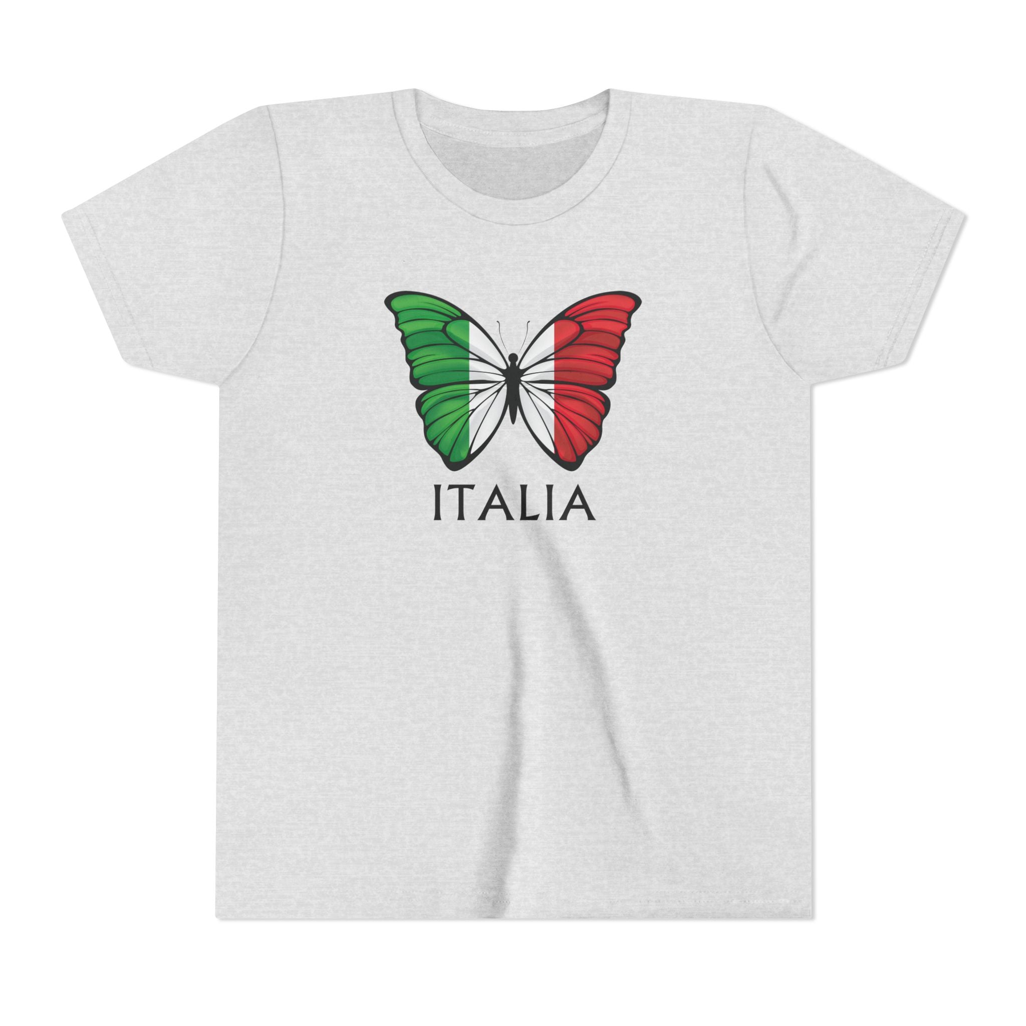 This Italian-themed t-shirt features a vibrant tricolored butterfly in the colors of the Italian flag, with the word "ITALIA" elegantly displayed beneath it. An adorable shirt for any child to wear with pride.
