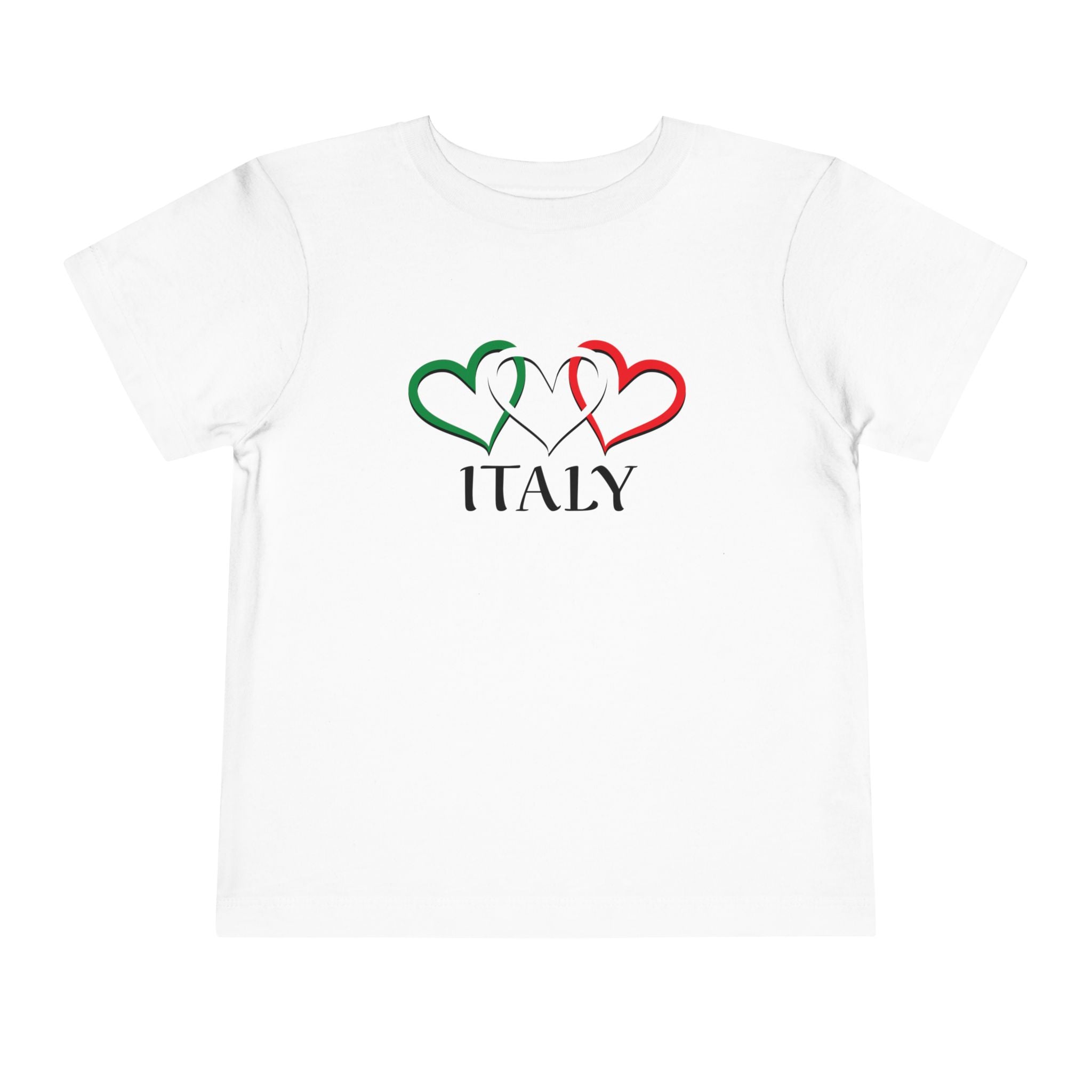 This Italian-themed shirt features three heart outlines, each in the colors of the Italian flag, Below the hearts, the word "ITALY" is boldly displayed, making it a perfect way to reflect a child's heritage of love of Italy.