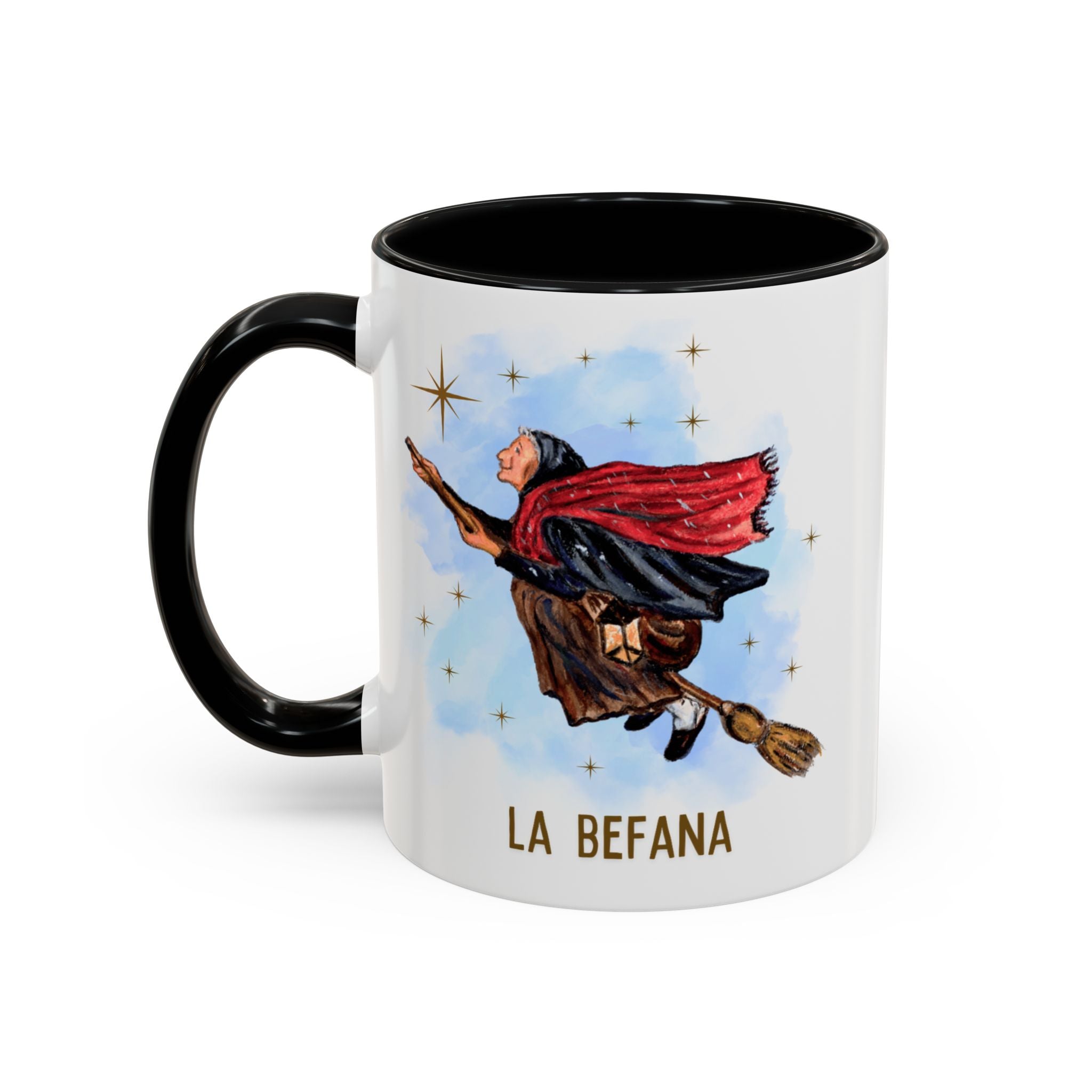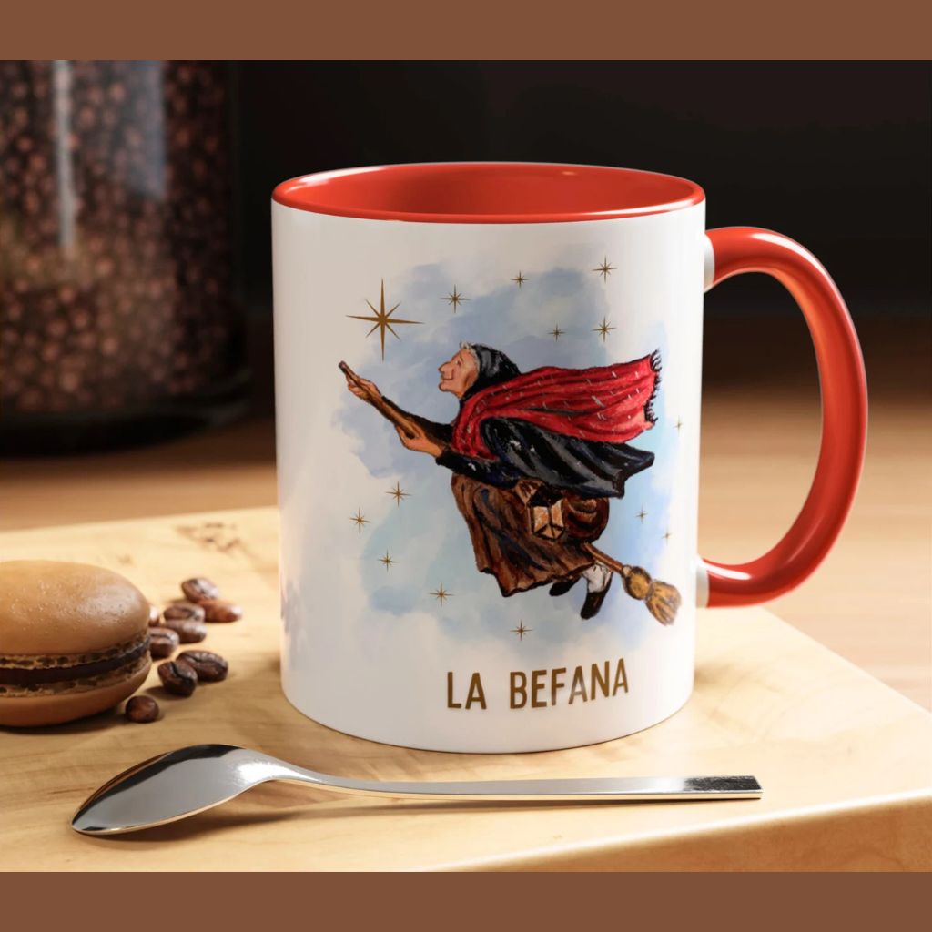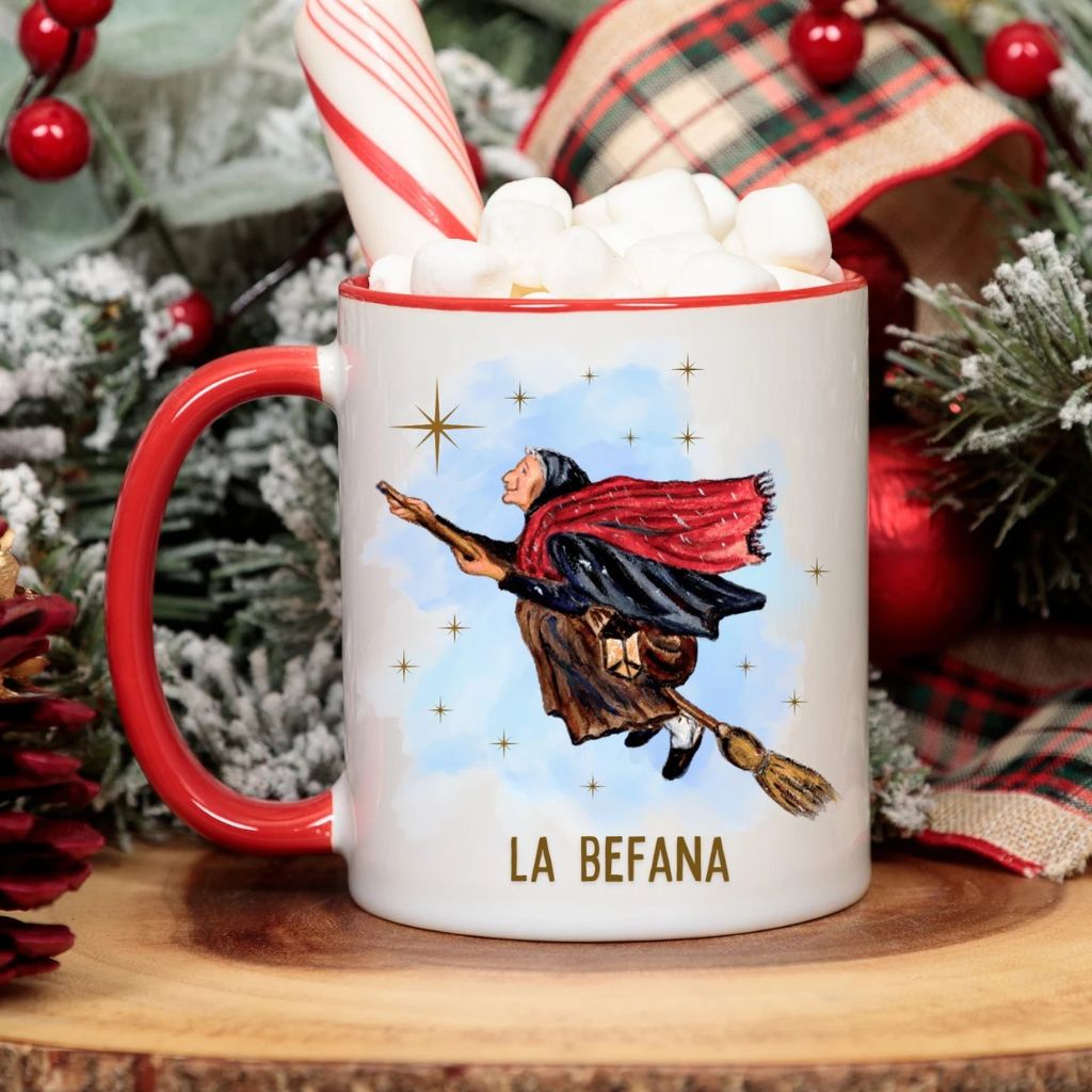 Our Befana mug features an original illustration from our book, The Night of La Befana, an