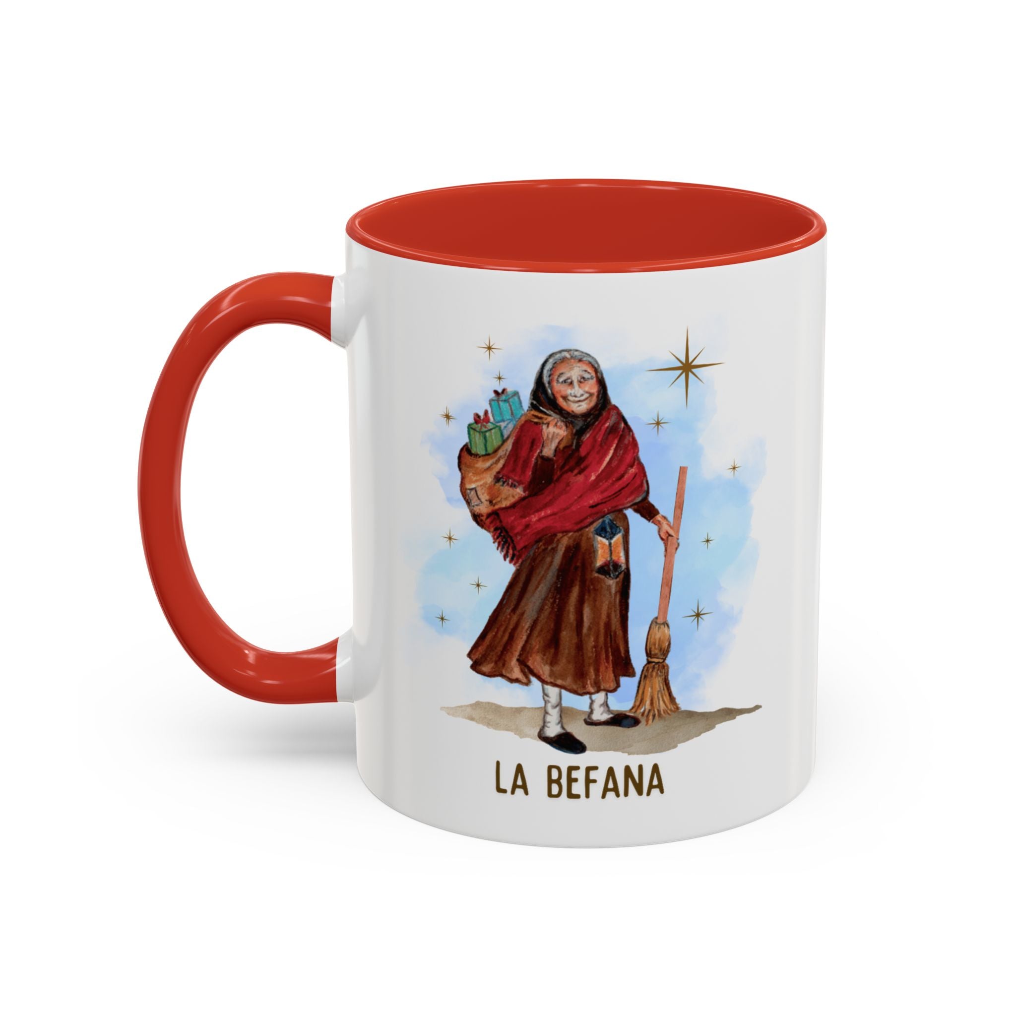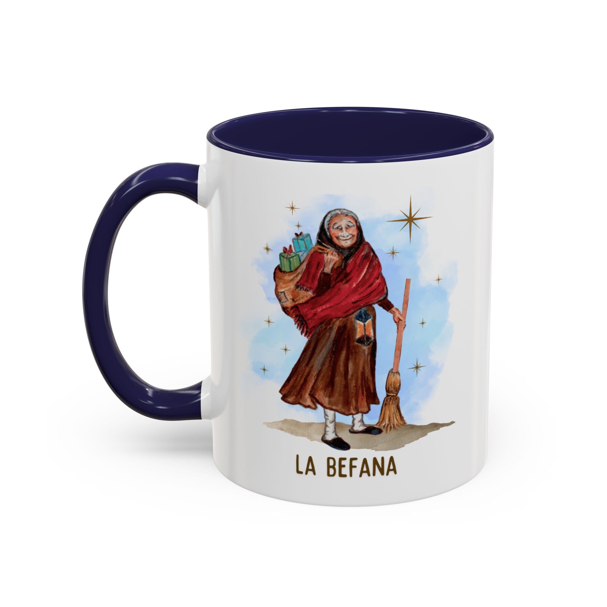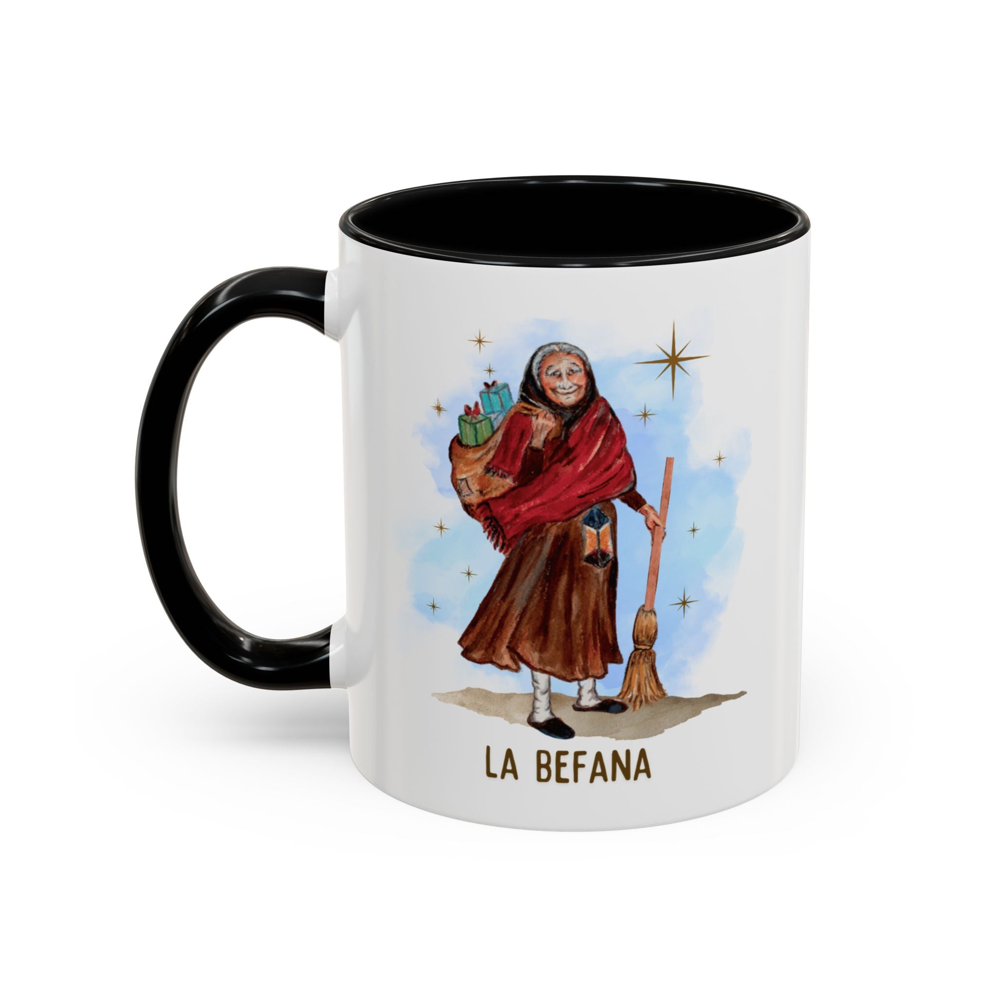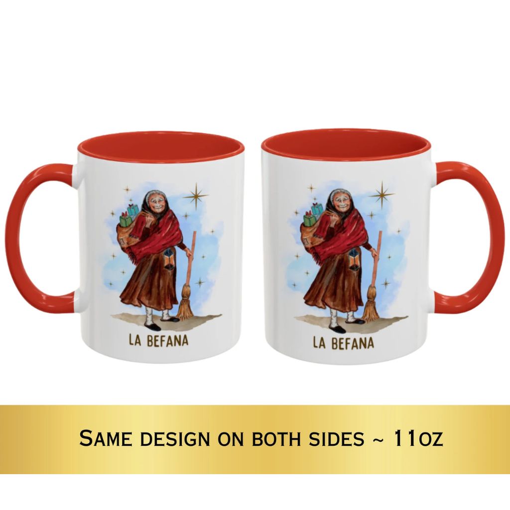 Our Befana mug features an original illustration from our book, The Night of La Befana, an Italian Legend. This book was a special project that my sister, Maria Centofanti Pritchard, and I created together. Maria retold this ancient Italian legend exactly as our Italian grandmother shared it with us. The illustrations, which I, Isabella Centofanti, created, drew inspiration from our father's village in Italy and from our beloved grandmother, who inspired the character of the old woman in the story.