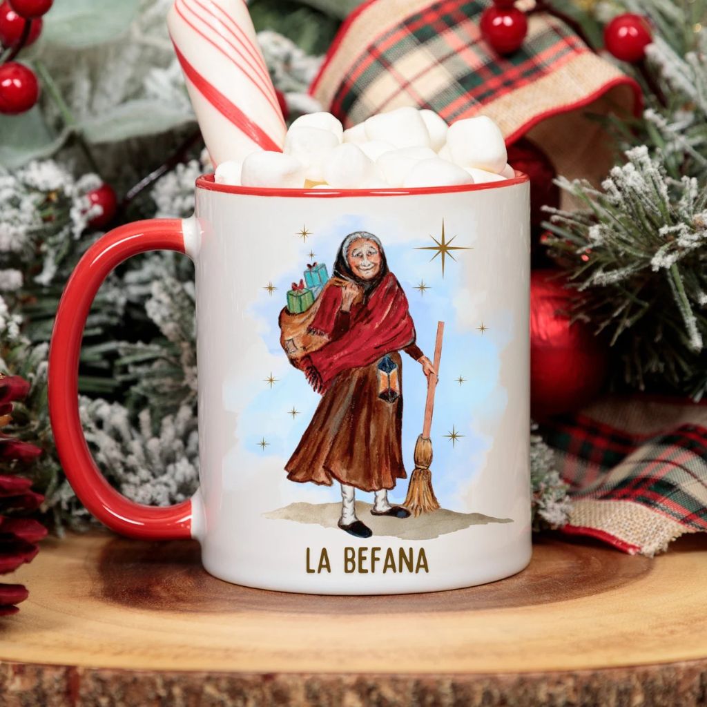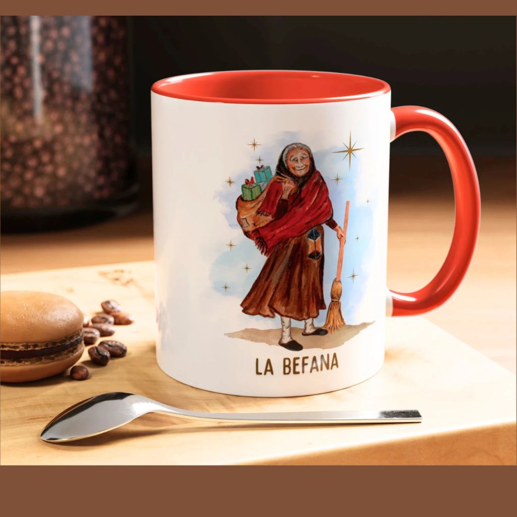 Our Befana mug features an original illustration from our book, The Night of La Befana, an