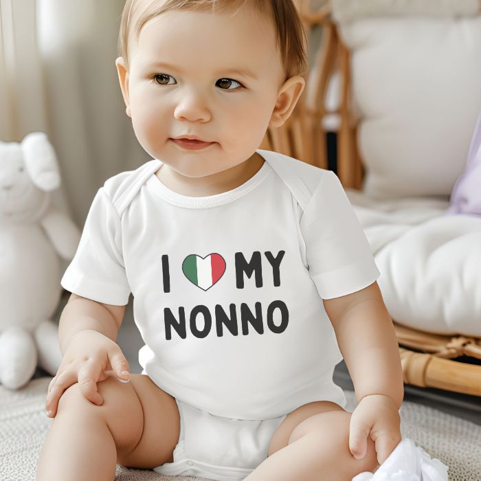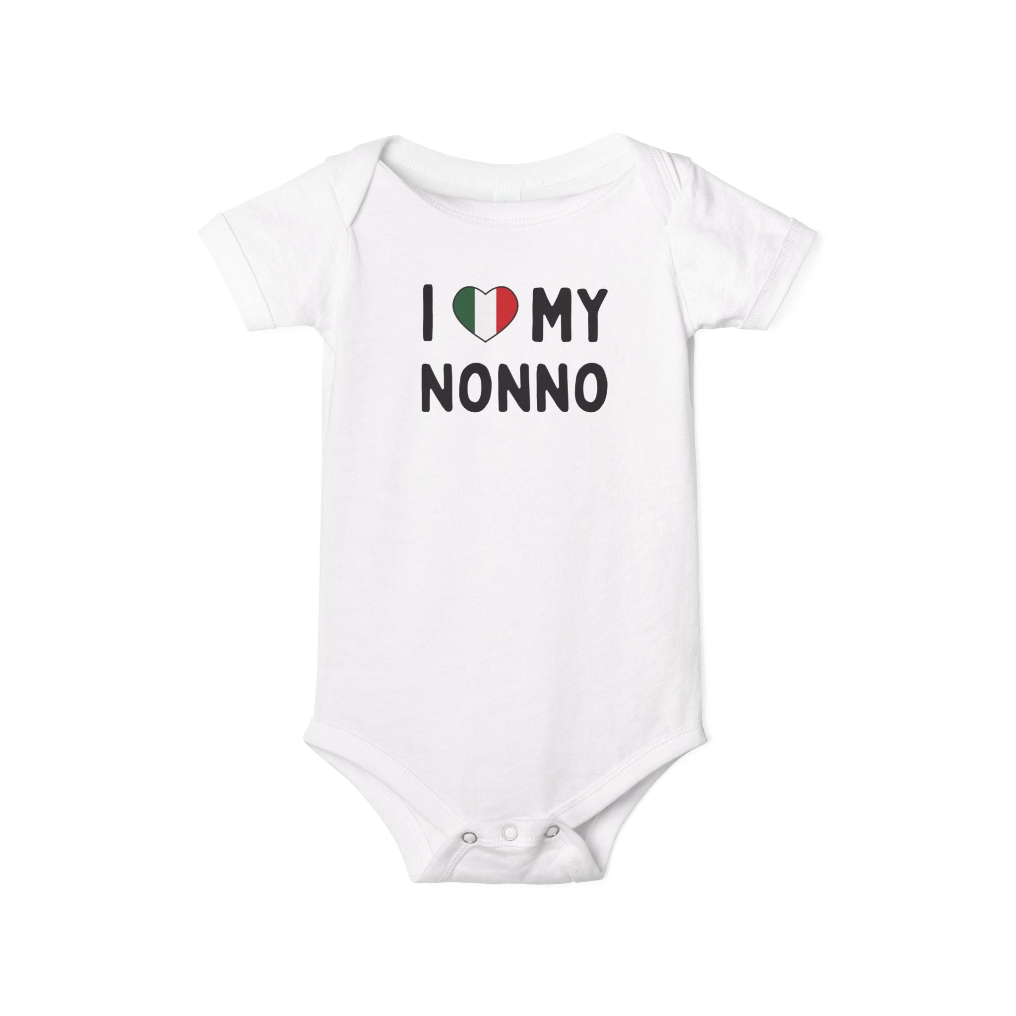 Show off baby’s love for Nonno with this adorable onesie! Features a heart filled with the Italian flag colors in place of 'love' and the sweet message: 'I ❤️ my Nonno' (Nonno means Grandpa in Italian)."