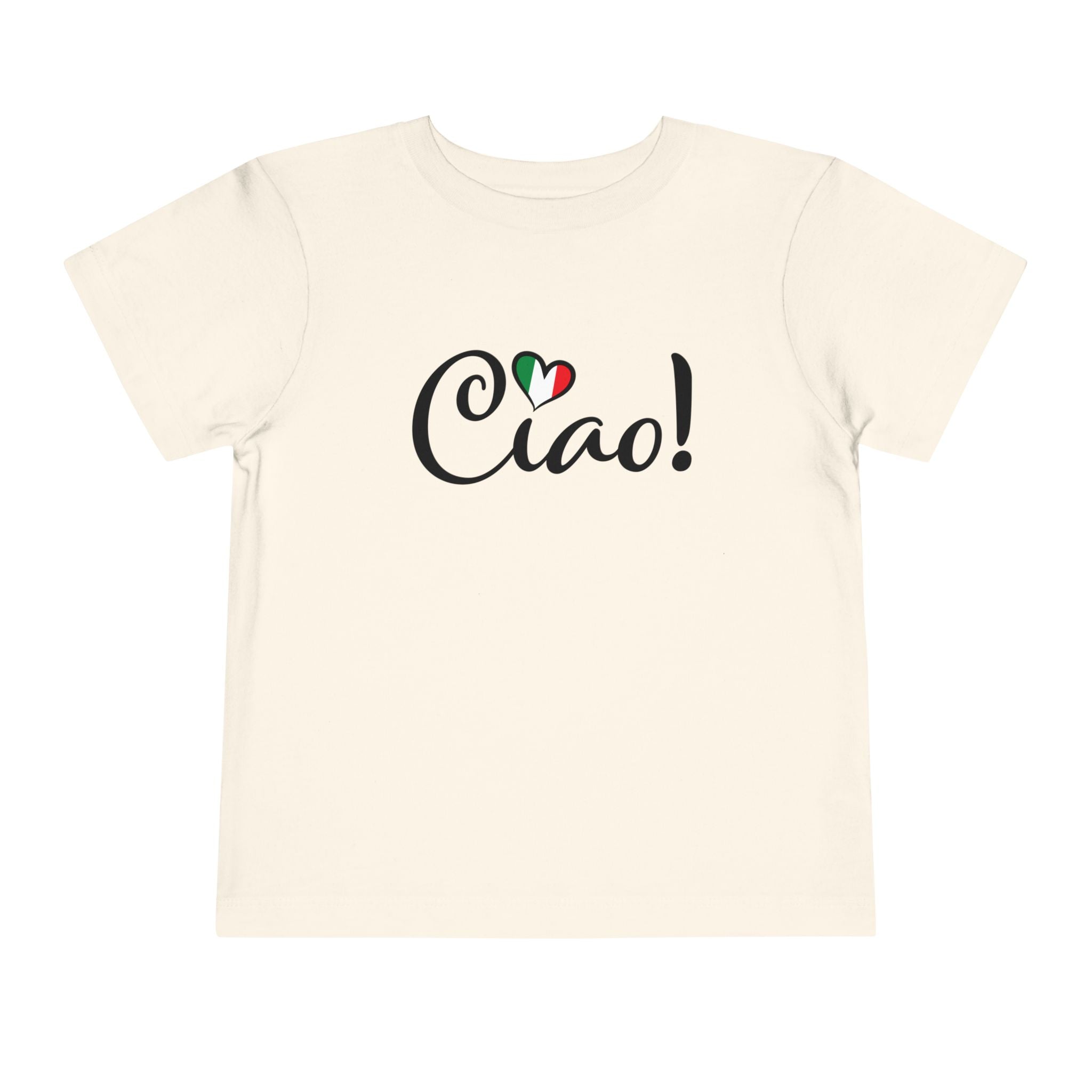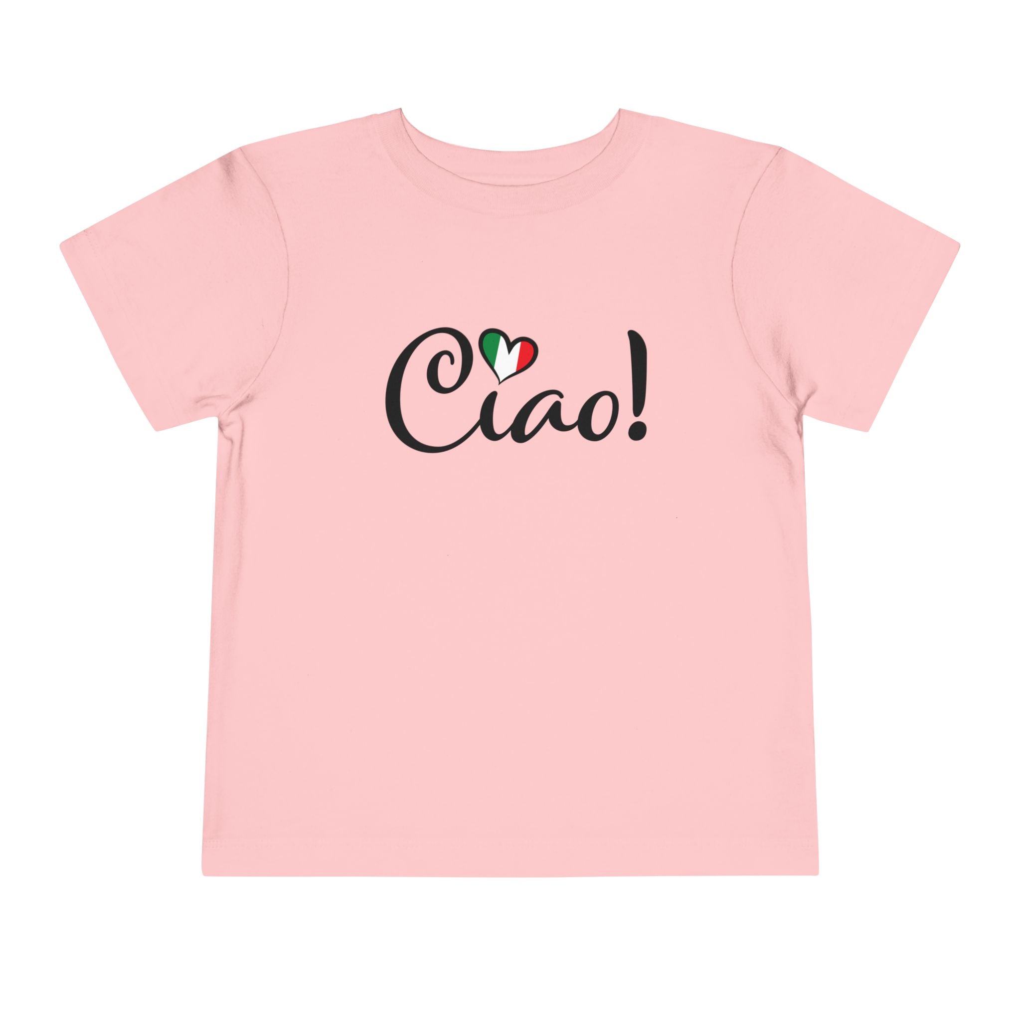 This Italian-themed shirt features the word "Ciao!" in stylish script, with the "i" dotted by a tri-colored heart in the Italian flag’s colors. A playful and patriotic way to say hello to Italy!